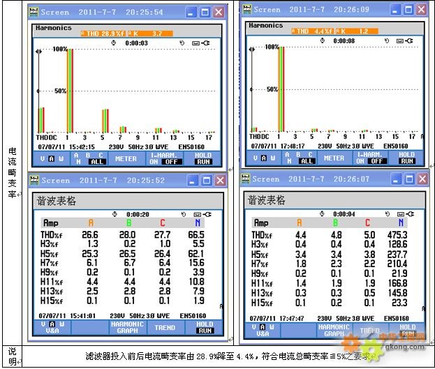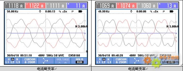 由以上數(shù)據(jù)可以清晰看出投入傳統(tǒng)無功補償裝置前后:配電系統(tǒng)電壓畸變率由4.8%放大到6.5%,超過國標(biāo)14549-93標(biāo)準(zhǔn);配電系統(tǒng)電流畸變率由9.5%放大到18.9%,總諧波電流由由112A放大到202A;配電系統(tǒng)電流波形由不規(guī)則單峰變成雙峰,主要放大諧波以5次和11次諧波較為明顯。