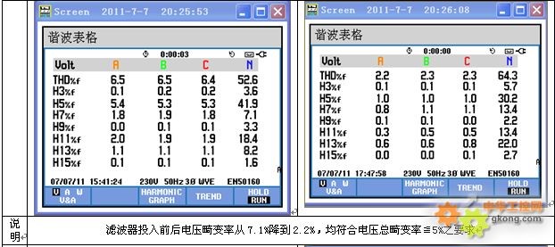 通過測試浙江某大型船舶制造公司的一個船塢配電室傳統(tǒng)無功補償投入前后數(shù)據(jù)可以清晰看到傳統(tǒng)無功補償對諧波嚴(yán)重放大的情況。