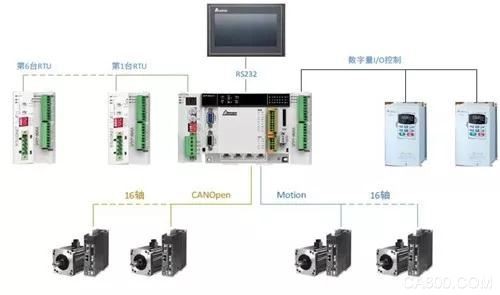 如圖所示,臺達(dá)多軸運(yùn)動控制器DVP-15MC系列配置外部編碼器為主控制器,搭配人機(jī)界面DOP-B系列以及其他控制元件(RTU-DNET遠(yuǎn)程DeviceNET模塊、 DeviceNet主站模塊等),可以監(jiān)控修改編碼器位置,在觸摸屏內(nèi)能夠存儲至少100種車型數(shù)據(jù),可以隨時(shí)調(diào)用;程序可以在線修改并下載,達(dá)到靈活運(yùn)動控制。