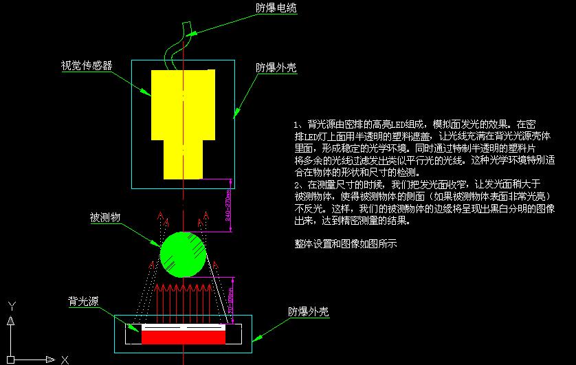在視覺傳感器外邊加一個密封防爆箱,防爆箱有一面選用同光率良好的防爆玻璃并使其與視覺傳感器的鏡頭一面緊貼,這樣既可以保證現(xiàn)場環(huán)境的防爆要求有可以確保視覺系統(tǒng)的拍照精度。