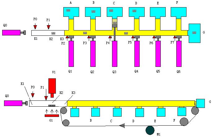 3.1 人工(或自動定位轉(zhuǎn)盤)將工件放置在透明檢測臺工位K1,光電開關檢測到元件存在,輸出信號給PLC,啟動氣缸Q0,將工件推到工位K2,光電開關檢測工 件到位后,觸發(fā)視覺系統(tǒng)V1和G1對工件進行視覺測量,20毫秒測試結(jié)束后,V1通過DO輸出結(jié)束信號和通過RS232將測量數(shù)據(jù)送給PLC,可編程控制 器(PLC)將自動記憶此工件的檔位,同時啟動Q0,將工件推到K3傳送帶上可傳送工位;