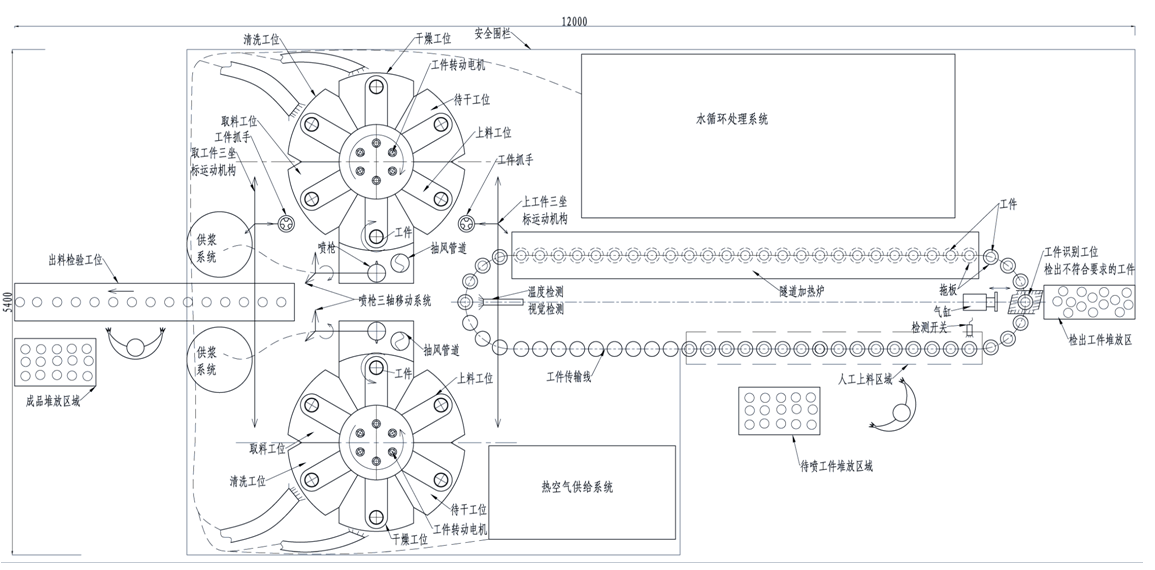 此生產(chǎn)線主要完成瓷坯的加熱及噴釉工作。主要由瓷坯加熱檢測(cè)系統(tǒng)、三坐標(biāo)上料機(jī)械手、瓷坯噴涂系統(tǒng)、六工位旋轉(zhuǎn)系統(tǒng)、清洗系統(tǒng)、干燥系統(tǒng)、三坐標(biāo)取料機(jī)械手、出料輸送線、人工檢驗(yàn)工位及安全防護(hù)系統(tǒng)等構(gòu)成。主要工作流程:人工完成瓷坯的上料、智能檢測(cè)系統(tǒng)完成工件的辨識(shí)、而后進(jìn)入隧道加熱、出爐后智能識(shí)別溫度及瓷坯中心、通過(guò)三坐標(biāo)上料機(jī)械手完成工件的抓取及噴釉上料工作、由兩坐標(biāo)移動(dòng)機(jī)構(gòu)+一旋轉(zhuǎn)軸控制噴槍的位置和姿態(tài)完成工件的噴釉、通過(guò)三坐標(biāo)取料機(jī)械手完成工件的抓取及放置、然后由輸送線將噴釉完成的工件輸送到人工檢驗(yàn)工位、由人工完成工件的檢驗(yàn)。此生產(chǎn)線具有高效率、高自動(dòng)化、高智能化等優(yōu)點(diǎn),能有效提高瓷坯噴涂的產(chǎn)能及噴涂質(zhì)量。具體設(shè)備功能及簡(jiǎn)述如下: