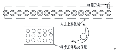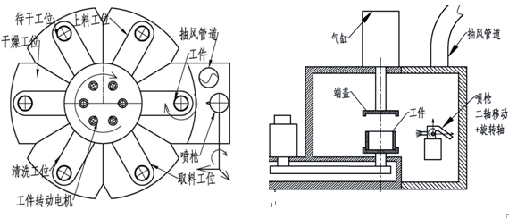 由于超聲波清洗有諸多不便,所以我們采用全新的設(shè)計(jì)理念,將蓋板固定在設(shè)備上,噴涂完成后,立馬對(duì)蓋板進(jìn)行在線清洗和干燥,然后重復(fù)裝載瓷坯噴涂,使得每種工件的蓋板數(shù)量減少到12件,即便于儲(chǔ)存,也便于更換,整體上也縮小了自動(dòng)生產(chǎn)線的占地面積(去除了超聲波清洗設(shè)備的占地),同時(shí)減少了整體生產(chǎn)線的設(shè)備投入,增加了生產(chǎn)線的可靠性。為配合全新設(shè)計(jì)理念是實(shí)施,采用Teflon噴涂工藝,使得蓋板及護(hù)罩內(nèi)部非常易于清洗。示意圖如下:
