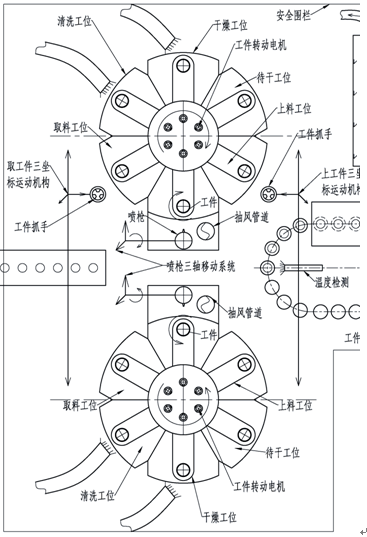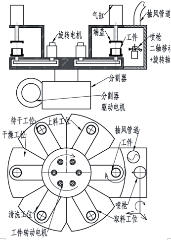 其重要功能是將瓷坯噴涂流程中的上料、噴涂、取料、清洗、干燥和待干六個(gè)工位設(shè)置在旋轉(zhuǎn)系統(tǒng)上,形成環(huán)形流水線,每個(gè)工位的總工作時(shí)間一定,由噴涂工位時(shí)間確定。他們的并列同時(shí)運(yùn)行將大大提高噴涂效率,縮短工作時(shí)間;六工位旋轉(zhuǎn)系統(tǒng)主要由分割器、轉(zhuǎn)盤(pán)、氣電滑環(huán)、工件轉(zhuǎn)動(dòng)機(jī)構(gòu)、噴涂護(hù)罩等構(gòu)成。