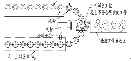 3) 檢測(cè)工位判斷是否為設(shè)定工件,如果不是則將瓷坯推出加熱爐輸送線,送入檢出工件堆放區(qū),如果是則加熱爐輸送線繼續(xù)前進(jìn);