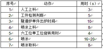 2) 由于六工位旋轉(zhuǎn)耗時(shí)與噴涂耗時(shí)是串聯(lián)進(jìn)行,所以單件生產(chǎn)的總時(shí)間為20~24s;