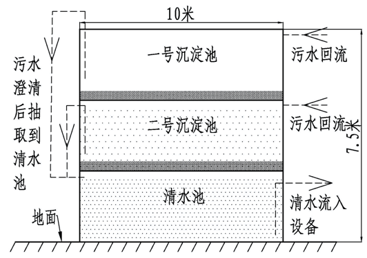 每件瓷坯噴涂完成后的沖洗設(shè)定用水量為5L,每天生產(chǎn)時(shí)間為20小時(shí),根據(jù)設(shè)備的產(chǎn)量3600件/10小時(shí),則總用水量=3600件÷10小時(shí)×20小時(shí)×5升=36000L。設(shè)計(jì)容量為50000L沉淀池,外形尺寸為2米×10米×7.5米、占地面積為20平米的三層沉淀池,其中兩層用于交替用于污水的沉淀,另外一層用于儲(chǔ)存沉淀后的清水,這樣就可保證污水的長(zhǎng)期循環(huán)使用。示意圖如下: