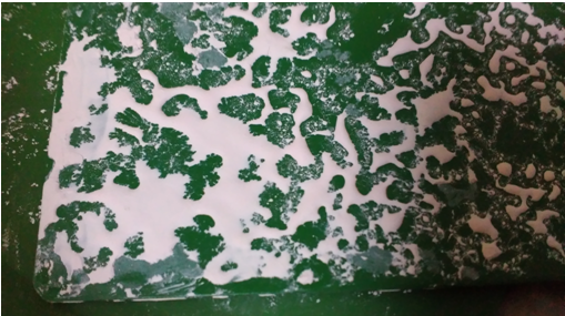 由于瓷坯噴釉對(duì)蓋板的潔凈度要求高,故蓋板在每次使用后必須清洗,為了便于清洗,在其內(nèi)表面噴涂有防粘性極好的Teflon材料;實(shí)驗(yàn)表明,釉漿噴涂在具有Teflon涂層的表面時(shí),不會(huì)成片附著,而是一團(tuán)一團(tuán)的(由于Teflon材料的疏水性好所致);下圖是噴涂后釉漿干燥固化的結(jié)果。