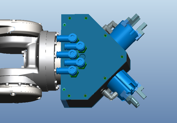 b) 方案采用重復(fù)精度為±0.03mm的六關(guān)節(jié)機(jī)器人和重復(fù)定位精度為±0.01mm的氣抓,而我們?cè)谠黾油獠枯S后人為降低了整個(gè)機(jī)械手的重復(fù)定位精度,所以需要較大程度的提高外部軸重復(fù)定位精度。此方案同時(shí)也降低了機(jī)械手工件裝配的理論可行性。