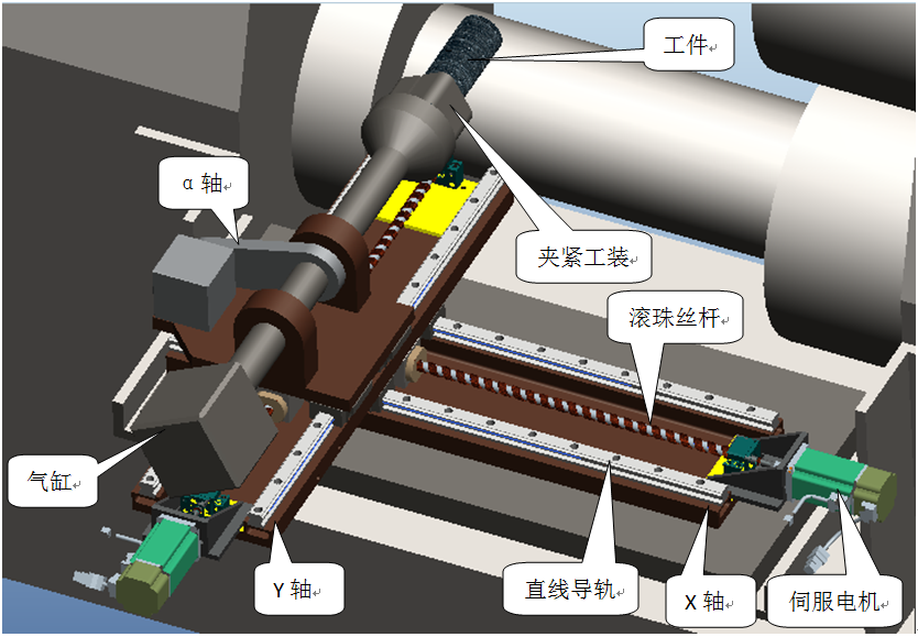 1. 輥軋機械手方案由X軸、Y軸、α軸、夾緊工裝、電控系統(tǒng)及氣路系統(tǒng)。XY 軸由伺服電機、直線導軌、滾珠絲桿和機座構成;α軸由伺服電機、同步帶、同步帶輪等構成;夾緊工裝由氣缸和夾緊機構等構成;