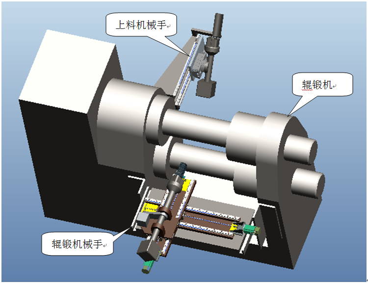 方案根據(jù)輥鍛特點設計的兩坐標、三軸機械手,可以適應不同品種的輥鍛要求;同時根據(jù)現(xiàn)場條件,定制安裝方式,減少現(xiàn)場安裝時間。機械手采用進口直線導軌、滾珠絲桿、伺服電機,確保機械手的品質(zhì)和使用壽命,設計上采用高安全系數(shù),保證機械手的可靠性。同時為了避免人工上料的不便,增加專用上料機械手,銜接中頻加熱爐和輥鍛機械手,實現(xiàn)二者無人化卸料和上料。