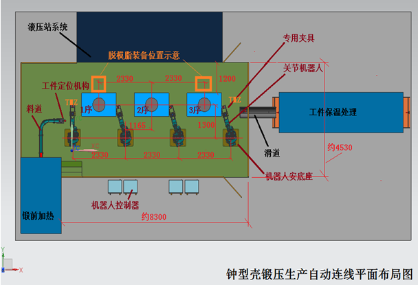 鍛壓設(shè)備需要按圖示進行位置調(diào)整,這是協(xié)調(diào)考慮上下料、模具更換、鍛造脫模脂供給、安裝及檢修維護等因素的結(jié)果。