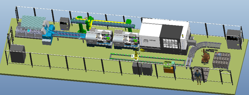 機(jī)器人主要實(shí)現(xiàn)數(shù)控車床和加工中心的上下料以及配合去毛刺設(shè)備去除聯(lián)軸器加工后的毛刺,并完成成品的裝箱工作。