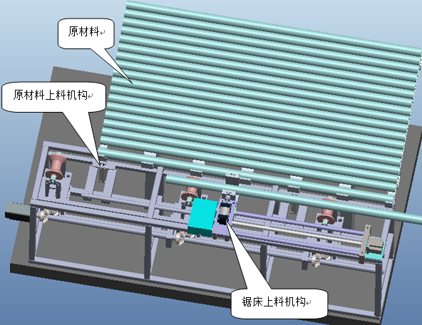 ? 原材料上料機(jī)構(gòu)的功能是將成排麻煩的棒料分揀到鋸床自動(dòng)上料機(jī)構(gòu)上。