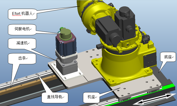 機(jī)器人七軸為機(jī)器行走機(jī)構(gòu),實(shí)現(xiàn)不同機(jī)床之間的上下料。此機(jī)構(gòu)采用伺服電機(jī)驅(qū)動(dòng),齒輪齒條傳動(dòng),直線導(dǎo)軌導(dǎo)向,底座采用型鋼焊接,分段制造、整體組裝。具體結(jié)構(gòu)見下圖。
