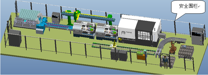 將所有運(yùn)動(dòng)設(shè)計(jì)布置于圍欄內(nèi),可以為工人及其他相關(guān)人員提供一個(gè)安全可靠的工作環(huán)境。圍欄布置有檢修和人工上料門,布置必要的檢測(cè)開關(guān),并與整套控制系統(tǒng)聯(lián)動(dòng)(當(dāng)然,為了學(xué)生參觀實(shí)習(xí)的實(shí)際需求,也可以不做聯(lián)動(dòng),僅僅做展示用),在設(shè)備正常工作時(shí),假如有人員闖入,將立即停止所有設(shè)備的運(yùn)轉(zhuǎn),確保人員安全。圍欄布置件下圖: