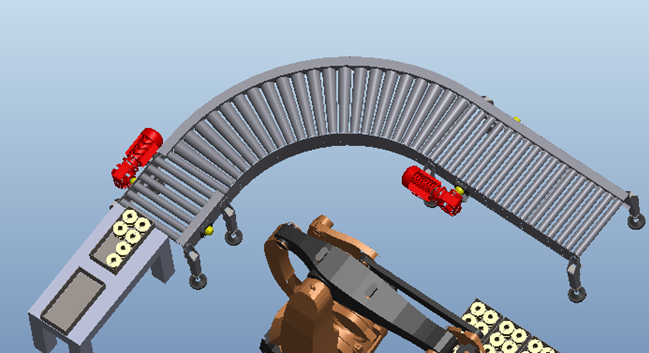 碼垛輸送線的功能是將整箱的聯(lián)軸器輸送到輸送線的另外一端,主要展示碼垛機(jī)器人的垛料來(lái)料方式基本為輸送線輸送。其主要由機(jī)架、減速電機(jī)、輸送滾筒、導(dǎo)向裝置、阻擋裝置、定位構(gòu)成等構(gòu)成。具體示意圖如下: