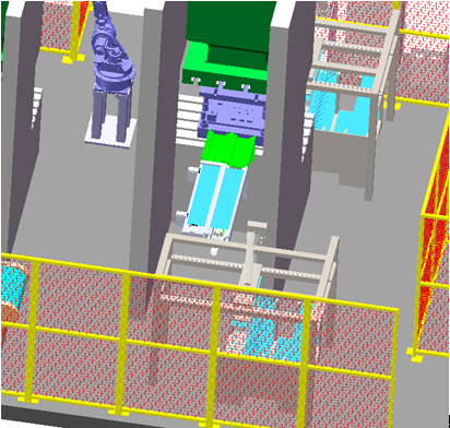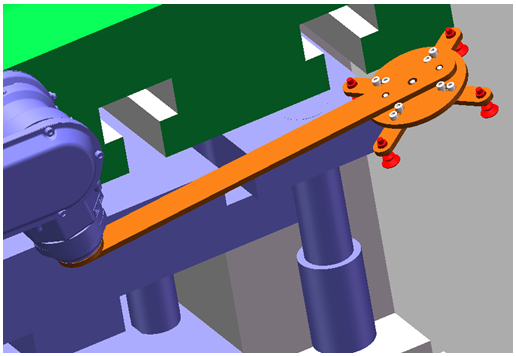 沖壓機床完成沖壓后,機器人得到系統(tǒng)響應信號,按要求使用抓手抓取工件。在沖壓連線過程中,六軸機器人只需在沖壓模具內抓取工件,即可將半成品送入下一個沖壓模具內。如下圖所示: