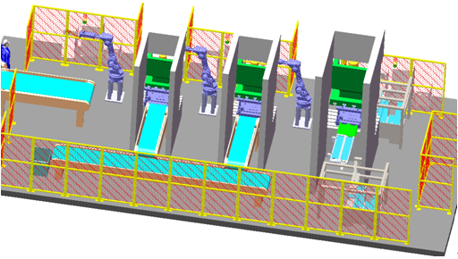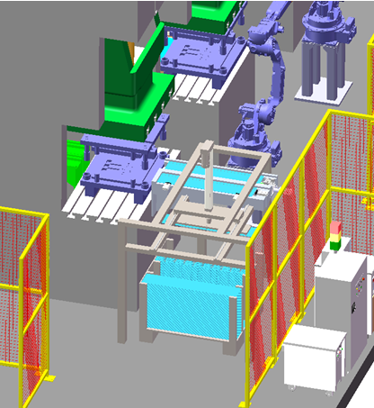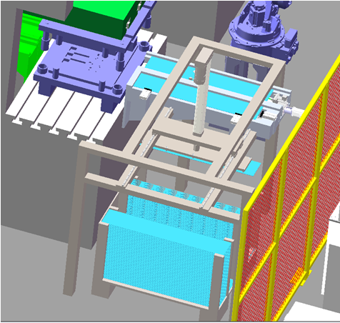 機器人將沖壓完成的工件放在輸送帶里,由其輸送至安全防護裝置外,操作員在安全區(qū)域對其進行質量檢測和人工下料堆放。