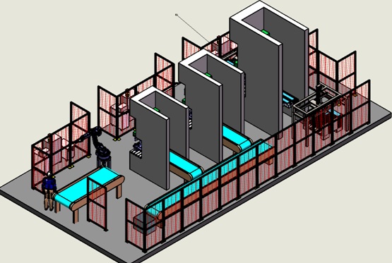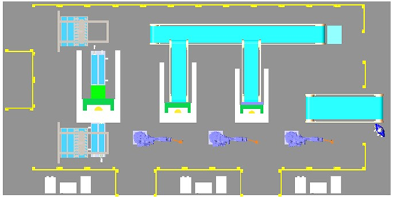 此系統(tǒng)為工業(yè)機器人沖壓連線系統(tǒng)。本系統(tǒng)選用三臺六軸工業(yè)機器人、配套機器人搬運夾手等專業(yè)設備,采用流水線對工件進行下料和上料,以完成沖壓產品的整個沖壓過程。