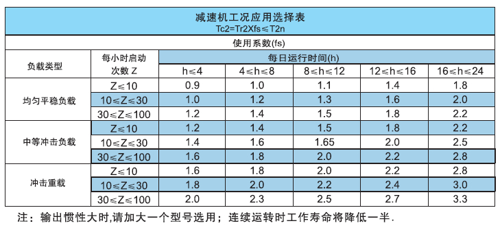 (4) 根據(jù)Tr2的值,和使用系數(shù)fs,計(jì)算在考慮實(shí)際使用狀況是的減速機(jī)扭矩:TC2,其中fs的選則見下表: