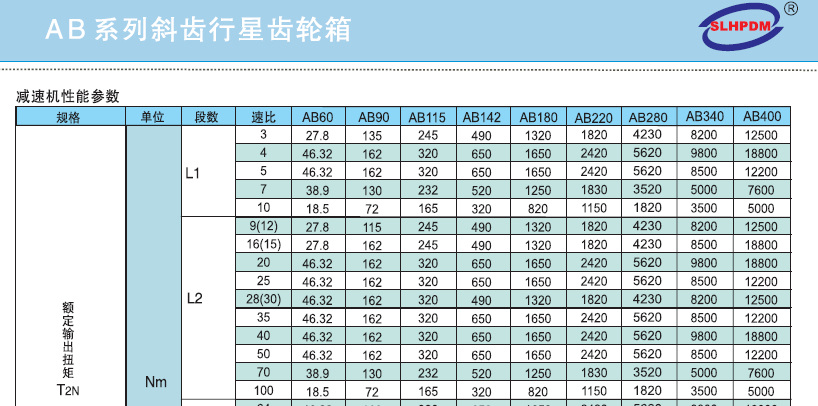 (5) 假設(shè)我們選擇:fs=1.3,則TC2= Tr2*1.3=114.6*1.3=149Nm;下一步查詢表格,要求選擇的減速機(jī)的額定輸出扭矩大于TC2這樣減速機(jī)就能滿足使用要求: