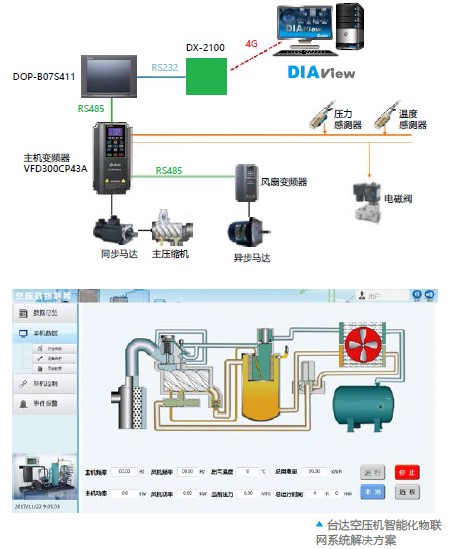 空壓機(jī)是一種用于壓縮空氣的設(shè)備,在工業(yè)中十分常見。傳統(tǒng)的空壓機(jī)采用工頻驅(qū)動,利用泄壓閥來保證壓力的穩(wěn)定;目前市場上的空壓機(jī)采用變頻器控制來實(shí)現(xiàn)自動壓力穩(wěn)定控制,更加節(jié)能,但在加智能化控制方面仍沒有很好的解決方案。針對這樣的市場需求,臺達(dá)憑借自身豐富的工業(yè)自動化產(chǎn)品和技術(shù)實(shí)力,結(jié)合空壓機(jī)的專業(yè)知識,開發(fā)出了貼合空壓機(jī)實(shí)際應(yīng)用需求的物聯(lián)網(wǎng)空壓機(jī)系統(tǒng)解決方案。