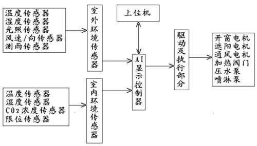 AI總線系統(tǒng)對蔬菜大棚作物生長的主要環(huán)境參數(shù)如溫度、濕度、光照、通風進行測控,實現(xiàn)在線閉環(huán)調(diào)節(jié)。實現(xiàn)對蔬菜的生長環(huán)境、技術管理、生產(chǎn)管理優(yōu)化的科學決策。系統(tǒng)結構如圖1所示。