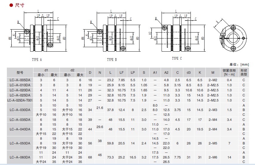 D. 確認(rèn)對(duì)軸向沒(méi)有壓縮和牽拉等作用力后,保證有效接觸長(zhǎng)度,每個(gè)聯(lián)軸器的夾持長(zhǎng)度克參考聯(lián)軸器的尺寸,要求大于2倍的C值,小于LF尺寸值。將2個(gè)夾緊螺栓鎖緊到所規(guī)定的扭矩。關(guān)于鎖緊扭矩請(qǐng)參照與相應(yīng)鎖緊扭矩一覽表。