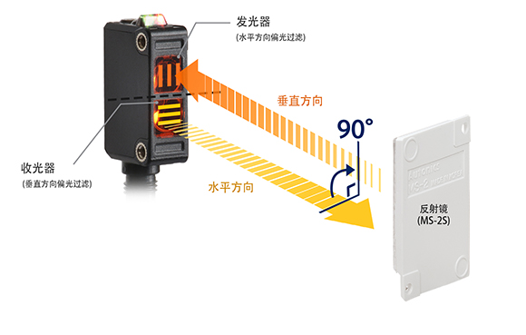 檢測物反射的光線將保持水平,因此不會被具有垂直偏振濾光片的收光器接收,可避免檢測誤動作。